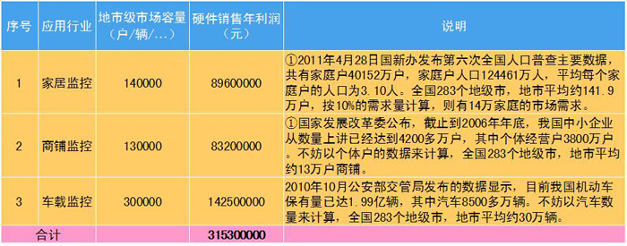 从上面的数据可以看出:在一个地市级城市,仅家居监控、车载监控、商铺联网三个行业的硬件销售的年利润就能超过3.1亿人民币,另外还有平台服务的利润。
