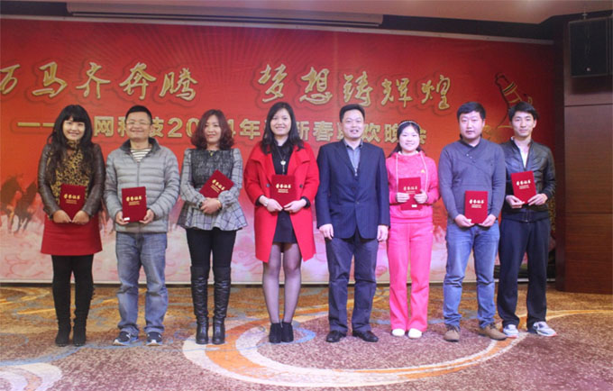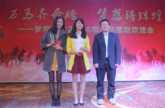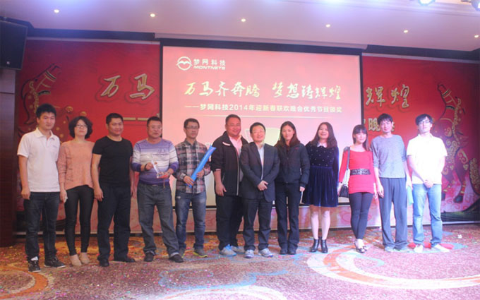 当晚6点半,主持人闪亮开场。随即举行了梦网科技企业文化活动2013感恩你我——“传递微笑正能量,关注梦网人背后的故事”笑脸征集活动颁奖典礼。本次活动自2013年12月由企业战略发展部启动以来,得到了全体同事的支持,经过初选、复选和全员公开投票,共选出2名“梦网微笑大使”和7名“梦网亲善奖”。晚会现场,总裁助理兼综合管理中心总经理章国志为7名“梦网亲善奖”颁发证书及奖金,公司董事长兼总裁余文胜先生为2名“梦网微笑大使”颁发奖杯及奖金。随后,余总裁针对笑脸征集活动做总结发言并就晚会致新春祝酒词,举杯邀朋共饮。