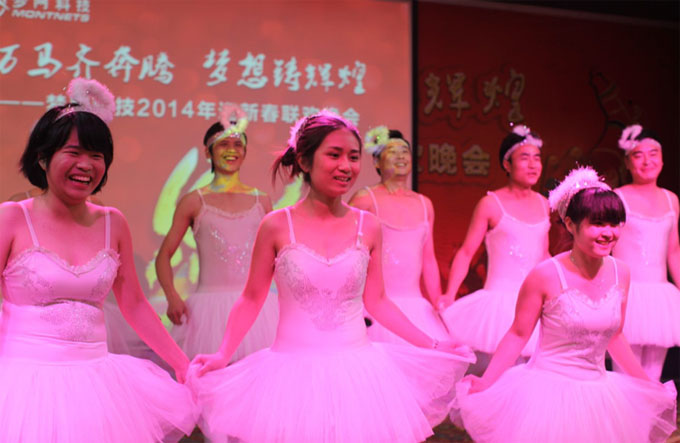 一曲充满着憧憬和祝福的《开门红》开启晚会节目热潮。随后,各个单位的同事带来包括个性独唱、活泼舞曲、搞笑小品、自创串烧、创意走秀等类型的20余个节目,均是同事在下班时间自排自演的心血之作,充分展现了梦网人多才多艺、极具创新的企业文化。公司股东杨诗晴女士作为特邀嘉宾上台,带来《我们的生活充满阳光》和《芦花》两首歌曲并献上自己的祝福,专业的演唱赢得了满堂好彩。